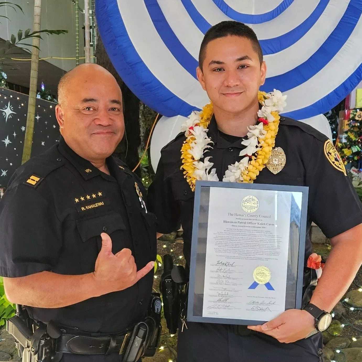 Hāmākua Patrol Officer Kaleb Caves was honored with the Haweo Award For his investigative skills resulting in the recovery of stolen property in multiple cases during his first two months on solo patrol.
